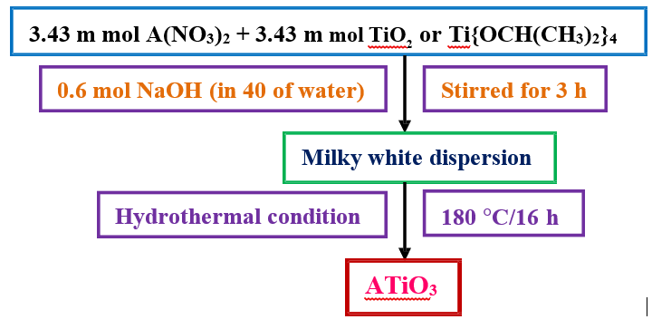 ATiO3 nanoparticles were synthesized by hydrothermal route. In typical synthesis process 3.43 m mol of A(NO3)2 was dissolve in 20 ml of double distilled water followed addition of 3.43 m mol of TiO2 (Titanium isopropoxide also). The above solution was stirred for 30 min and then 0.6 mol NaOH dissolved in 40 ml of water were added and stirred for 3 h. The obtained milky white solution was transferred to teflon beaker and putted inside the stainless- steel hydrothermal bomb and placed in oven at 180°C for 16 h. The schematic diagram for the synthesis of ATiO3 nanoparticles of different morphology is given in scheme 1.
