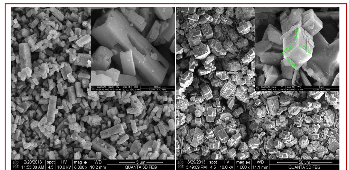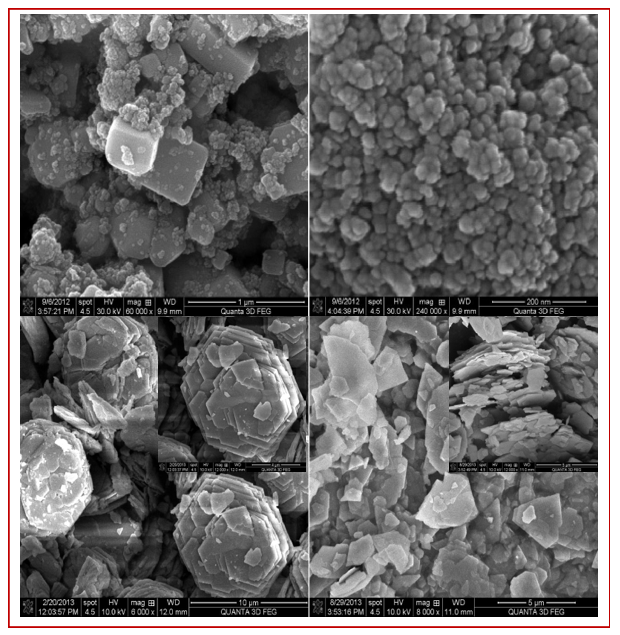 Field emission scanning electron microscopy was carried out to check the morphology of these synthesized titanates. Figure 2 and 3 show the field emission scanning electron micrograph of titanates. Figure 2a shows cube shape morphology of CaTiO3 obtained using TiO2 whereas in case of titanium isopropoxide (Figure 2b), rectangle hollow shape morphology was obtained. This result clearly indicates that with change in source phase from solid (TiO2) to liquid (titanium isopropoxide) the morphology was changed. This hollow morphology type’s materials are very interesting for various applications such as drug delivery and catalysis [47-49]. The SrTiO3 (Figure 2c and 2d) the particles are spherical in nature having two different sizes for the two different titanium sources. For the titanium isopropoxide source, the particles are smaller as compared to titanium dioxide. In the case of TiO2 source some of these nanoparticles (30 nm size) are aggregated and form cube shaped structures. The BaTiO3 nanoparticles size distribution (Figure 3b) is very uniform in case of titanium isopropoxideas Ti source and it is found to be very small in size (further confirm by TEM) as compared to TiO2 sources. The BaTiO3 obtained from TiO2 (Figure 3a) shows the formation of mixed morphology i.e. spherical and cube. For CdTiO3, sheet like morphology was obtained in both the cases. The size of sheet is smaller and broken in case of liquid phase sources. These sheets like structures are very useful for the formation of 2-D materials for practical applications.