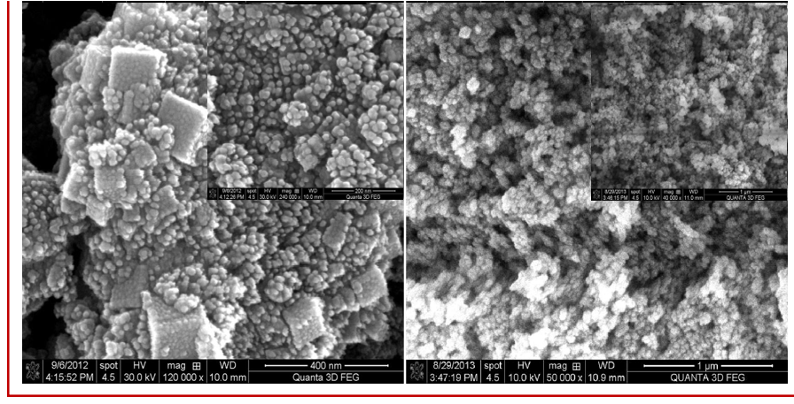 Powder X-ray diffraction studies (PXRD) were carried out using Ni filtered Cu-Kα radiation. Normal scans were recorded with a step size of 0.02° and step time of 1 s. The Kα2 reflections were removed to obtain accurate lattice constants. Field emission scanning electron microscopy (FESEM) was carried out by FEI quanta 3D FEG – FESEM operated at 10 kV. The pellet had been coated with gold. Transmission Electron Microscopy (TEM) studies were carried out using a Tecnai G2 20 electron microscope operated at 200 KV. TEM specimens were prepared by dispersing the sample in ethanol by ultrasonic treatment, dropping onto a porous carbon film supported on a copper grid, and then drying in air. Nitrogen adsorption–desorption isotherms were recorded at liquid nitrogen temperature (77 K) using a Nova 2000e (Quantachrome Corp.) equipment and the specific area was determined by the Brunauer–Emmett–Teller (BET) method. The powder sample was degassed at 150 ºC for 6 h prior to the surface area measurements. Diffuse-reflectance spectra (DR) spectra were recorded on Shimadzu UV-2450 spectrophotometer where the baseline was fixed using a barium sulfate reference.