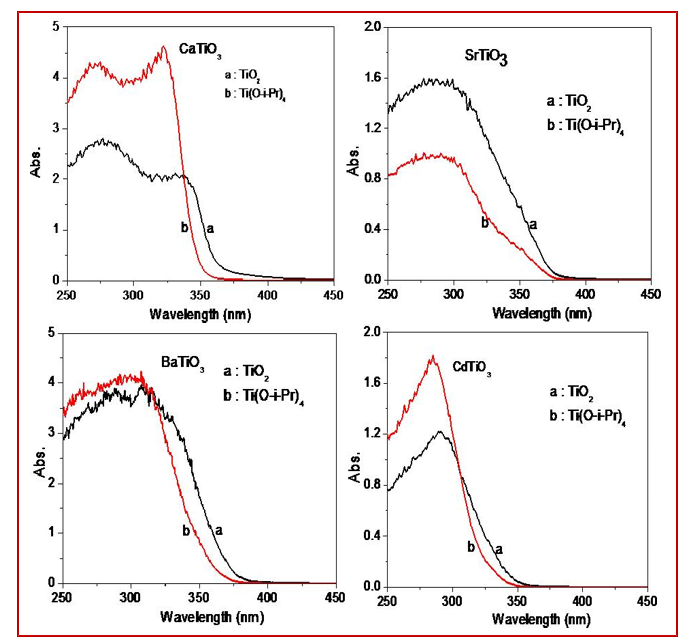 N2 adsorption-desorption measurement was carried out for surface area measurements of the nanoparticles (Table 1). It was observed that as titanium source changed from solid phase (TiO2) to liquid phase (titanium isopropoxide) the surface area of the titanates enhanced along with decrease in particle size. In case of CaTiO3 and BaTiO3, the surface area is more enhanced due to the hollow shape particles (CaTiO3) and small in BaTiO3 in case of titanium isopropoxide as Ti sources. Figure 5 shows the diffuse reflectance spectra of the all the titanates. It was observed that as titanium source changed from TiO2 to titanium isopropoxide the band gap of the titanates increased due to decrease in particle size. All the titanates have band gap in the UV and close to the reported value. The optical properties (band gap) of nanomaterials are size and morphology dependent [52, 53]. For several cases, it is observed that a change in size and morphology can alter the band gap. The band gap of all the titanates is given in Table 1.