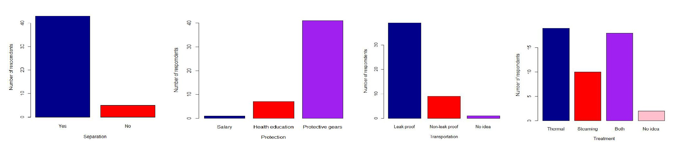 Equipment are very important in transportation of medical wastes. Track, push carts, and wheel burrows have been suggested by about 80% of respondents to be used in transportation of medical wastes since they are said to be leak proof and puncture resistant, 18% of respondents suggested non-leak proof and non-puncture resistant (plastic bags), and only about 2% of respondent had no idea about using leak and non-leak proof plastic bags (Figure 3; Transportation).