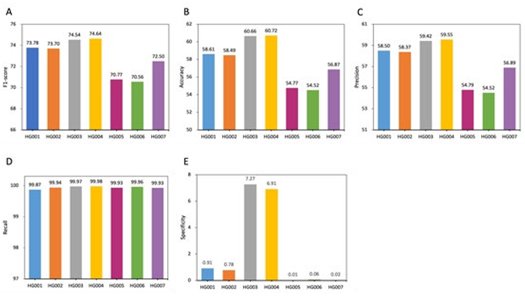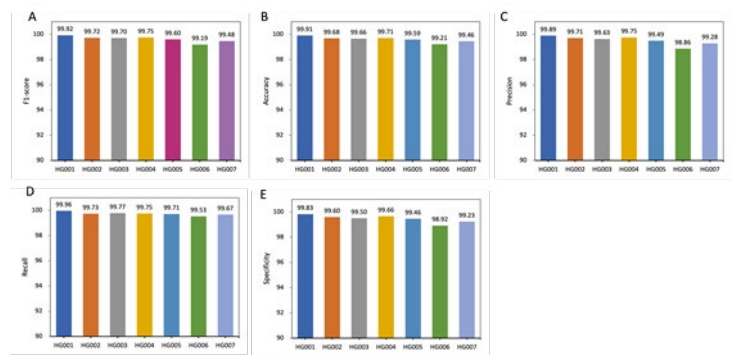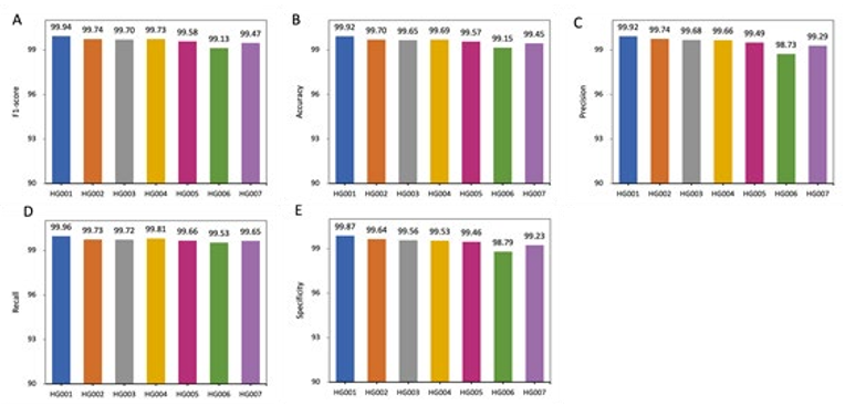 Figure 4: Performance comparison within DL_v11 (after deep learning) based on 5 metrics. All values are in percentages unless oth- erwise indicated. All datasets used here are from the GIAB consortium reference samples (HG001-HG007). An independent model is trained for each sample. DL_v11 achieves the best performance on HG001, with an f1-score of 99.94. Lower scores were achieved on the other human genomes with the Han Chinese(HG006) ancestry genome performing the poorest.