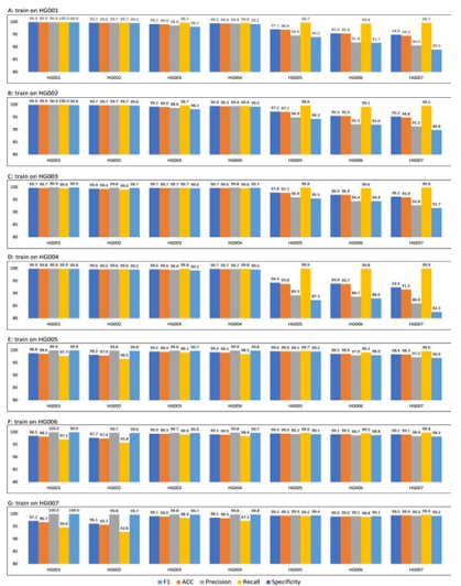 Figure 5: Performance comparison within DL_v11 (after deep learning) for different trainsets. The model achieves better performance when the test and training data come from the same sample. When the training and test data come from different sources, the algorithm performance will be affected. For example, in A Barplot, the training data is chromosome 1 to 19 of HG001(Utah/European), and the test data is chromosome 20 of HG001 to HG007. On HG001 all five metrics achieve a performance of 99.9, but the model predicts more false-positive mutations on HG005/HG006/HG007 (Han Chinese) of14 different ethnicities, resulting in a lower Specificity