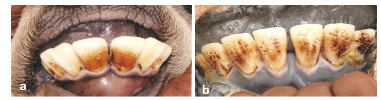 Figures 1: Dental fluorosis in bovine calf (a) and adult (b) characterised with regular and irregular horizontal light to deep brownish staining strips on the surface of anterior teeth.