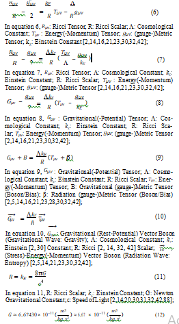 In equation 1, Gµν : Gravitational (Rest-Potential)2,7–9 Tensor (Boson); λ : (original)2,7–9,23 Cosmological Constant; gµν : gauge-Metric2 Tensor (Boson); kE : Einstein2,7–9 Constant (Scalar)30; Tµν : (Stress-)Energy(-Momentum)2,16,21 Tensor (Boson);