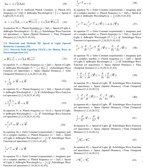 Light displays a property known as polarization (ever since 1669), which might be mainly related to and indicating the possibility of the particle-wave duality nature of the photons of light [20,31,43]. Physicists found it challenging to explain this phenomenon (i.e., the polarization of light) according to the pilot wave theory [20,31,43,54,74,75]. Einstein believed light is a particle (Photon) and the flow (of photons) is a wave [2,20,43]. Photons (of light) are (the most compact possible) packets of electromagnetic energy [20,31,39,40]. This theory (of Pilot-wave particles) couldn’t explain phenomena such as black body radiation (e.g., black hole Hawking radiation) and photoelectric effect (light) [5,20,31,41,43,78]. The original double-slit experiment, by Thomas Young (1801), demonstrated that (the Photons of) light acts as a wave (and particle), revealing its quantum nature: the particle-wave duality nature of (the Photons of) light [16,20,31,36,40,43,75, 77]. The Photons of a light wave (equation 43) might have no mass but still carry energy (and momentum) [20,31]. Maxwell (1864) discovered that electric and magnetic fields travel through space moving at the same speed of light as a wave (and particle) [20,31,43,75]. Maxwell’s electromagnetic theory states that light is a propagating wave of electric and magnetic fields, describing the interaction between the electric field (electricity) and the magnetic field (magnetism) [2,31]. In theoretical (and mathematical) physics, any theory with this property (i.e. particle-wave duality) might (have the principle of) supersymmetry (SUSY) [2,43,57,79].