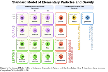 LQG studies these discrete chunks of the spacetime network [1,46]. In string theory, spacetime is ten-dimensional (nine spatial and one temporal dimension) in such discrete chunks of LQG [46,54,55]. In M-theory though, spacetime is eleven-dimensional (ten spatial dimensions, and one dimension for time) in such discrete chunks of LQG as well, hypothetically [46,54,55]. Work on formulating the fundamental principles underlying M-theory (String theory) has considerably diminished due to the lack of experimental (validation and) platform [54,55]. Bosonic string theory was eventually superseded by theories called superstring theories [54,74]. In theories of supersymmetry (or supersymmetric theories), each boson has a counterpart, a fermion, and vice versa in the standard model of subatomic particles in physics [57,58]. The strongest scientific argument in favor of string theory appears to include a theory of gravity (within it) [54-56]. In this context, M-Theory might be an encompassing (unifying) idea inside the string theory, stating that there might be strings vibrating in 11-dimensional spacetime [1,2,46,54,55,70,74]. The premise behind string theory is that everything is composed of tiny strings of energy (waves) [3,43,46,54,55,70,71,74, 75]. These strings will comprise all the matter, energy, and tiny forces (bosons) in the standard model of subatomic particles [54,55,58,63]. At the time of M-theory proposal (1984), there were already five different variations of string theory existing, but Witten proposed that each of these string theories might be the manifestation of the same thing, a single underlying building block of the universe, the Schrödinger Wave function of spacetime [1,54,55]. String theory describes how the strings of energy (waves) can propagate through the fabric (structure) of spacetime while interacting with each other (within the standard model) and Higgs field (boson) [1,2,43,45, 54,55,60,74,75]. A string might look like an ordinary particle (standard model), with its mass, charge, and other properties (e.g., spin) determined by its vibrational state [54,55,58,62]. In this way, the different elementary particles may look like vibrating strings [54,58]. One of the vibrational states of a string might give rise to the Graviton, a subatomic (quantum mechanical) particle that carries the gravitational force [11].