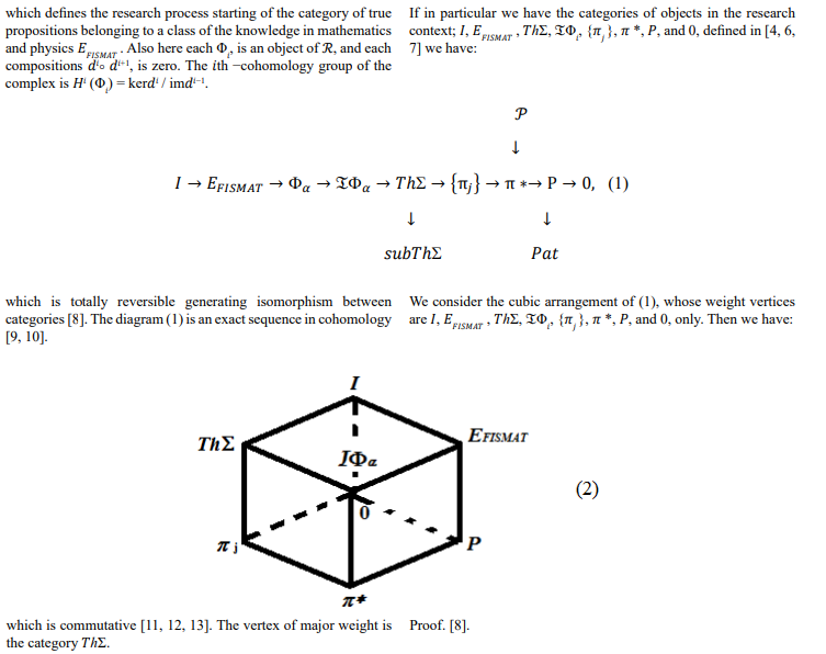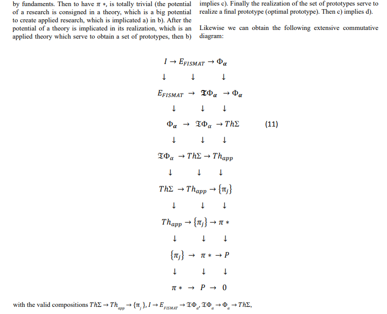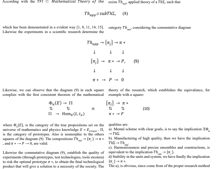The research method by fundaments arises considering the “research” as an object of study both in its process, as in its resolution to obtain results in all areas of the knowledge. The research method by fundaments is a most important result obtained from the mathematical theory of research realized and obtained considering the identification of certain invariants that define it and its realization in scientific research on applied sciences where the observation directly is impossible and requires an extension of the observation, the creation of a valid hypothesis to a field deduction and analysis on true propositions (already demonstrated and evident facts), the creation of a theory ThΣ, as entity fundamental and generator of true propositions and new true propositions further knowledge [1-5]. But also, in the experiments development comes enforced with the true propositions as results of a research operatoron the set of true propositions which we denote as Φα , in the class α, or knowledge type α (for example a knowledge class can be the belonging to a sub-branch of a study branch). The proof, will be on the theorems and experiments supported by these theorems(almost always are the true propositions obtained by. Then the final law obtained is a theorem, which has more weight than a law. The theorems are eternal. The laws are changing depending on the context or environment where they occur. Likewise, one of the most important results obtained under this research theory is the flow diagram of the research methods by fundaments. The spaces or nodes are derived categories of objects in goal of study that is the scientific research. Likewise, the spaces , are set objects with morphisms (arrows) between them and whose inverses generate quasi-isomorphism between these spaces. The laws of identity and associativity to their compositions of these objects are satisfied. Likewise, we have the following considerations.
