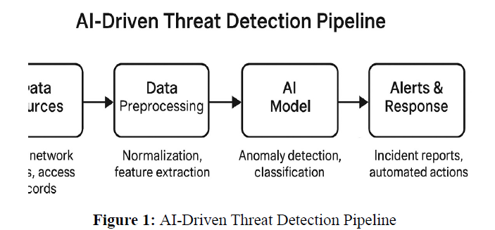 Figure 1 illustrates how LLMs and generative AI modules can be integrated into a threat detection pipeline. Data from IoT sensors, log repositories, and traffic monitors is first preprocessed and segmented before being analyzed by LLMs. These models identify behavioral deviations and context-rich anomalies. Simultaneously, GANs may simulate adversarial behaviors to improve model robustness via adversarial training.