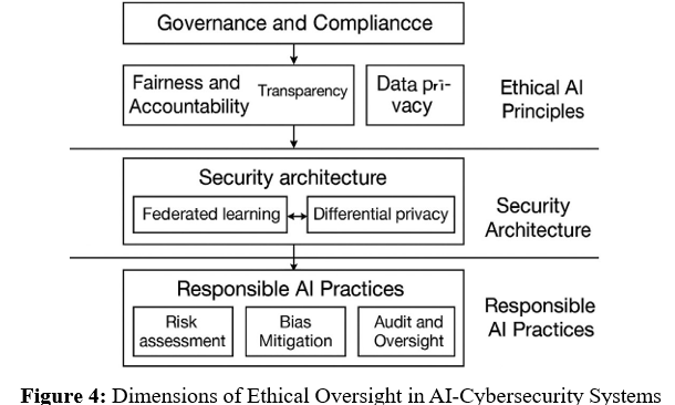 Figure 4 illustrates the three pillars of ethical governance: system transparency, hu- man control, and regulatory alignment. Together, they form a triad necessary for estab- lishing trustworthy AI in cybersecurity.