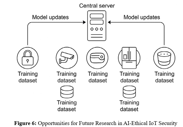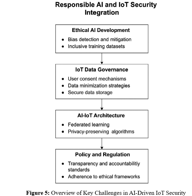 In conclusion, the path to deploying effective, equitable, and secure AI in IoT cyber- security is fraught with challenges. Success will depend on adopting privacy-by-design architectures, fairness-aware modeling practices, and robust defense strategies against ad- versarial manipulation. These considerations must be embedded not as optional add-ons, but as integral pillars of AI system development and governance.
