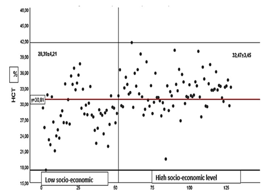 There are different laboratory tests that are employed to diagnose anemia such as Hematocrit, Hemoglobin, and Red blood cell count [22]. Hemoglobin detects directly anemia while Hematocrit is an indirect indicator. The practice of using three-fold converted He¬matocrit shows that there is a correlatio bettween hemoglobin and hematocrit. In our series, we observed that the low socioeconomic level population who have à large proportion of hemoglobin un¬der 11 g/dl is followed by Hematocrit value under 30%. However, the high socioeconomic level population had higher hemoglobin average (11.19 g/dl) and higher hematocrit average (32.47%) too.