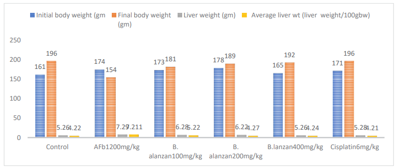 The rats were randomly assigned to the experimental and control groups (n=6). Group 1 rats were given 0.9% normal saline. Group II rats with chemically induced HCC (AFb1) were given a single oral administration of AFb1 (200mg/kg b.w.). Group III rats received 100 mg/kg b.w.i.p. of B. lanzan in Ethyl Acetate. Groups IV and V were given i.p injections of 200 and 400 mg/kg/b.w, respectively, whereas Group VI rats received 6 mg/kg b.w of cisplatin.
