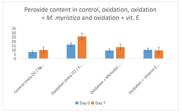 Peroxide value determination measures the amount of peroxides and hydroperoxides in lipid samples. Peroxide determination is a nice indicator of oxidation of oils. In the present study the peroxide values of oxidation of palm fruit oil increases from day zero and day 7 due to the increase in the formation of both hydroperoxide and peroxide. The peroxide value decreases in the experiments that Monodora myristica extract was added or vitamin E was added, this suggested that both Monodora myristica or vitamin E prevented the oil from oxidation due to their antioxidant and anti- radical effects. Our study is in line with the works of Womeni et al., and Alizadeh et al., Conjugated diene and triene are produced when double and single bond rearranges to form dienes and trienes during the preliminary stages of peroxidation [37,38]. These can be detected through the maxima absorption utilizing a UV spectrophotometer. The rate of CD and CT formation decreased significantly (p < 0.05) in the palm fruit emulsion treated with Monodora myristica or vitamin E (Figures 5 and 6).