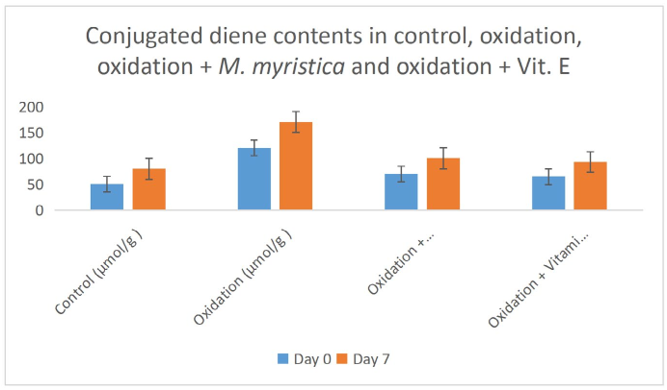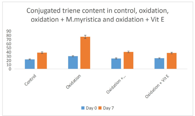 Conjugated diene and triene was determined in control, oxidation, oxidation + Monodora myristca and oxidation + vitamin E at 0 days and 7 days according to the method of Abdalla and Roozen, [29]. Fifty milligram of samples were weighed and mixed with 5ml of cyclohexane and the CD and CT was determined using a UV spectrophotometer at 234 and 270nm respectively.
