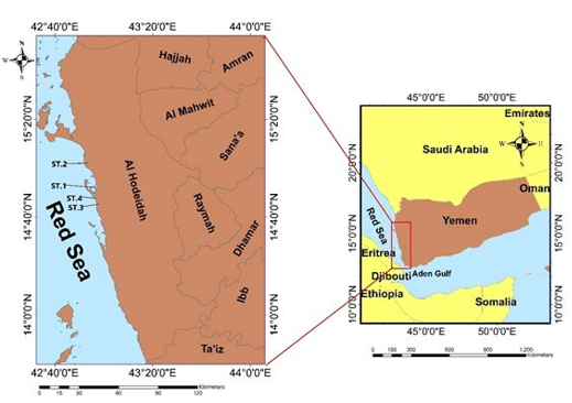 The area under investigation is laying from the south eastern part of the Red Sea in the coast of Yemen, Hodeida City. It extends from Hodeida power plant which is located at latitude 15° 00' 20" N and longitude 42° 56' 02" E to Fishing port in the south at 14° 46' 54" N latitude and 42° 56' 50" E longitude. The distinctive ar- eas are namely Al Hodeida port, Hodeida power plant, Fishing port and The Corniche of Al-Hodeida (Figure 1 and Table 1). The sam- pling stations were located by Global Positioning System (GPS).