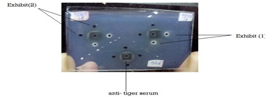 The illegal killing or poaching of wild animal species in India is becoming more and more serious concern, with animals being taken for fur and meat. Wild life species like tiger are threatened with extirpation or extinction. Forensic samples analysis of animal remains help to provide evidence for assailant [1, 2]. (Bertino and Bertino, 2015, Knecht, 2012 Use of immuno-electrophoretic methods is rapid specific and sensitive and is more useful for identification of species origin. Although DNA has widely replaced immunological methods of analysis in forensic cases, but in particular situations, immuno-electrophoretic methods may still be a valuable tool in criminology [3].
