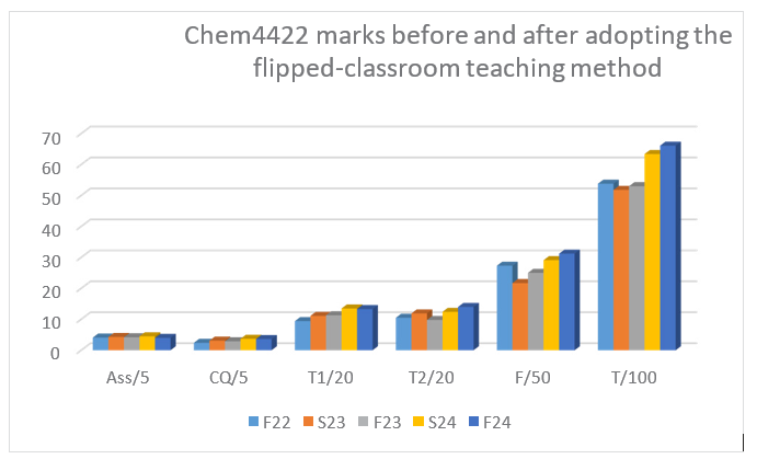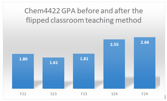 Given the low performance of students in the intermediate organic chemistry course, as demonstrated by the low A and high F rates and the low GPA outlined above, the traditional lecture-based teaching method used in the course was inverted to a flipped classroom teaching method in Spring 2024 and Fall 2024 semesters [40]. The flipped-classroom teaching method reported herein differs from the previously adopted methods. The flipped classroom method employed is distinct with simple resources. Neither graduate teaching assistants nor undergraduate learning assistants (ULA) were involved. No special or sophisticated software or programs, or interactive platforms (vide supra) were used. In the flipped classroom method reported herein, pre- class resources included the course-designated textbook, instructor lecture notes, and videos recorded by the instructor and uploaded to a dedicated Facebook account. In- class activities were entirely student-centred and devoted to problem-solving and practice. To the best. We report herein an incredibly successful flipped-classroom teaching method in an intermediate organic chemistry course in an undergraduate Chemistry degree (BS) at Sultan Qaboos University.