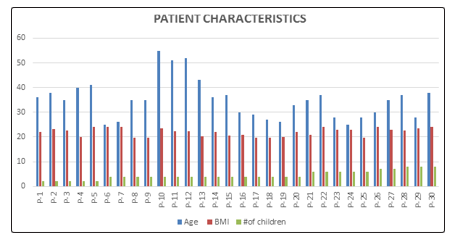 At the initial consultation visit 30 patients were examined to determine their suitability according to the above inclusion and exclusion criteria. All patients submitted to treatment had passed inclusion criteria and had provided written informed consent forms. All patients testified to suffering from urinary incontinence and sexual dysfunction, and expressed their desire to improve their sign and symptoms. The patients aged were between 25-55 years old with sexual dysfunction in stress incontinence confirmed by patient history and aerodynamic study. The patients’ average body mass index was 24.15 (range 19.25-30.49) and Five subjects had given birth twice, fifteen fourth, five sixth, two seven, and three had undergone eight deliveries. Seven patients had caesarian section delivery; the rest of them had vaginal delivery. The patient’s demographics and relevant histories are given in (Figure 3).