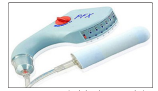 The laser system used was the Action II Er: YAG delivering a wavelength of a 2940 nm. When fitted with dedicated vaginal scanning scopes (Petite Lady System) the laser can be operated in the multiple micro pulse mode (pulse width of 250 us, selectable number of multiples), or in the long- pulsed mode (1000ms, single pulse). There were two scopes comprising the dedicated vaginal scanning scope system (Figure 1). One scope delivered a 360 ring – shaped beam with an approximate beam width at target of 2-3 mm (Petite 360), and the other delivered around-shaped 90 beam with an approximate beam width at target of 5 mm (Petite 90), both scopes being supported in the vagina by a specially designed guide (Figure 2). In general, for the 360 scope the supporting guide is inserted, and then the scope is fully inserted into the guide. The body of the scope is marked with 2.5 mm gradations. The laser parameters are set including the multiple pulse option, the laser is fired, the probe is withdrawn by 1 gradation (2.5 mm) marked on the probe body, and the process repeated for the entire length of the vaginal canal. Multiple passes may be made. For the 90 scope in the treatment of urinary incontinence, following insertion of the supporting cage the probe is inserted with the active part of the scope at the 12 O’clock position. The laser is fired, and the scope turned to the 2 O’clock position, fired again, then turned to the 10 O’clock position and fired again. The scope is withdrawn by 2 gradations (5 mm), return to the 12 O’clock position, and the process is repeated for the required number of passes. To treat the entire vaginal wall with the 90 scope, however, for each set of shots the active part of the scope is set at the 12 O’clock, then 2 O’clock, 4 O’clock, 6 O’clock, 8 O’clock and 10 O’clock positions, the scope is withdrawn by 2 gradations, and the process repeated [2].