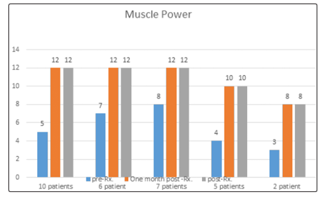 Reading of all subjects was compared at base line, one-month after treatment and 2 months after the final session. Improvement was seen in all PFX2 scores (Figure4). Before the intervention: seven patients had score 8, six had score 7, ten had score 5, five had score 4 and 2 had score 3. After one-month of treatment six patients had score 9, six had score 8, eleven had score 7, six had score 4, and one had score 3. Post intervention: twenty-three patients score 12, five score 10 and two score 8. (76.6% max. improved, 16 % moderately improved, 7.4% min. improved). (Figure 5).