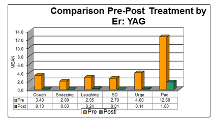 Conclusions: Er: YAG laser treatment for urinary incontinence and sexual dysfunction produced significant improvement. With multicast delivered in the multiple micro pulse modes via 90 and 360scanning scopes, nonsurgical Er: YAG laser treatment was pain-free, safe, side effect free, easily tolerated and effective.