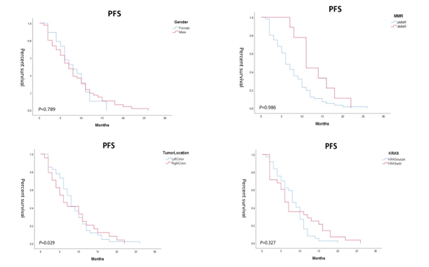 127 patients were included, 87 males; 40 females; the age range was 41-81 years old, with a median age of 60 years; there were 65 patients who received immune checkpoint inhibitors(ICI) and 62 patients who did not receive immune checkpoint inhibitors; 84 cases of left colon cancer (including left transverse colon, descending colon, and sigmoid colon), and 43 cases of right colon cancer (including cecum, ascending colon, and right transverse colon); 9 cases of patients with dMMR, and 118 cases of patients with pMMR; 63 cases of patients with KRAS mutant type, and 64 cases of patients with KRAS wild type; 86 cases of patients who combined targeted therapy in the course of treatment, 41 cases of patients who did not combine targeted therapy, specific detailed data are shown in Table 1.