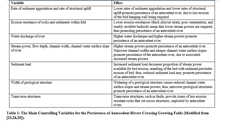 These different responses are probably due to changes in the fold- river interactions with time and the variable and complex nature of river systems [9,14,41,42]. There may be different reaction, relaxation and recurrence times for events, multiple processes may act in combination to produce a specific phenomenon, different factors may result in similar effects, a river system may not adjust in a progressive and systematic fashion to modifications, and a river system may be dominated by autogenic processes and exhibit variability independent of external factors, due to systems of non- linearity or self-organised criticality [10,42-46]. Nevertheless, with such systems there may be characteristics of the river or the fold which act as thresholds which the river needs to cross for the dynamic equilibrium of river incision across an active fold to develop and be maintained [43]. The characteristics which may act as thresholds will probably include those associated with the main controlling variables for the persistence of an antecedent river across a growing fold, shown in Table 1.