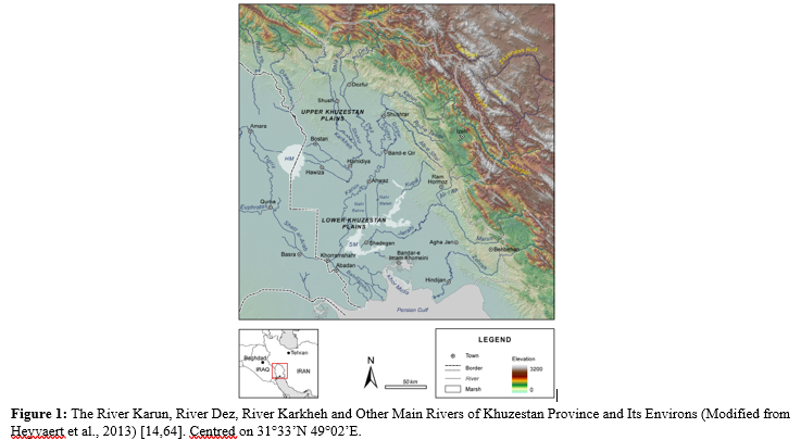 To introduce and demonstrate the use of the new scheme of 13 geomorphological characteristics, it has been applied to the River Karun, River Dez and River Karkheh in lowland south-west Iran in the province of Khuzestan, as an example. As shown in Figures 1 and Figure 2, the major rivers Karun, Dez and Karkheh (mean annual water discharge 575 m3s-1, 230 m3s-1 and 165 m3s-1, respectively) flow from the Zagros orogen in the N and NE across the Upper and Lower Khuzestan Plains into the Mesopotamian- Persian Gulf Foreland Basin to the S and SW [62]. Some of their interactions with folds within the Upper and Lower Khuzestan Plains have been subjected to detailed investigations [14,21,55].