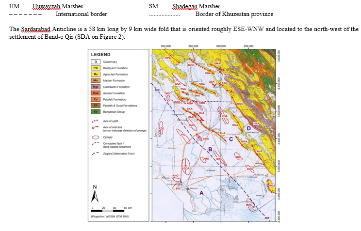 Figure 2: The Broad Scale Geology of South-West Iran, Showing Selected Anticlines, Oilfields and Oilfield Anticlines in the Lowlands (Modified from NIOC, 1973, using Various Sources) [14, 21, 65, 66]. Centred on 31°14’N 48°46’E. Structural Geology: AGA = Abu ul-Gharib Anticline, AHA = Ahvaz Anticline, AJA = Agha Jari Anticline, AOA = Ab-e Teymur Oilfield Anticline, ASA = Abu Salibi Anticline, AZO = Azadegan Oilfield, BKA = Band-e Karkheh Anticline, DMO = Dasht-e Mishan Oilfield, DOA = Dorquain Oilfield Anticline, DPA = Dal Parri Anticline, DVA = Darreh-ye Viza Anticline, DZU = Dezful Uplift, GMA = Gach-e Moh Anticline, HAA = Hamidiyyeh Anticline, HKA = Haft Kel Anticline, JFO = Jufeyr Oilfield, KHO = Khorramshahr Oilfield, KNA = Kuhanak Anticline, KUA = Kupal Anticline, MAO = Mahshahr Oilfield, MEO = Mehr Oilfield, MQO = Mushtaq Oilfield, MRA = Marun Anticline, MSO = Mansuri Oilfield, NSA = Naft-e Safid Anticline, OMO = Omid Oilfield, QSA = Qal'eh Surkheh Anticline, RGA = Rag-e Safid Anticline, ROA = Ramin Oilfield Anticline, RRO = Ramshir Oilfield, SDA = Sardarabad Anticline, SDO = Shadegan Oilfield, SHA= Shahur Anticline, SIO = Siba Oilfield, STA = Shushtar Anticline, SUO = Susangerd Oilfield, TKA = Turkalaki Anticline, ZDF = Zagros Deformation Front (purple dashed line), ZUA = Zeyn ul-Abbas Anticline. Geology: Q = Quaternary (c. 1 Ma–Present; Generally Unconsolidated Alluvial Sands, Muds, Gravels, and Marls). Plb = Bakhtyari Formation (Middle Pliocene to Pleistocene, c. 3 Ma–1 Ma; Well-Consolidated Conglomerates, Sandstones, and Mudstones). Ma = Agha Jari Formation (Middle Miocene to Middle Pliocene, c. 10 Ma–3 Ma; Sandstones, Marls, and Mudstones). Mm = Mishan Formation (Middle Miocene, c. 16 Ma–10 Ma; Marls, Limestones, and Aandstones). Mgs = Gachsaran Formation (Early Miocene, c. 23 Ma–16 Ma; Anhydrite and Salt, Limestones, Marls, and Shales). Oas = Asmari Formation (Oligocene–Early Miocene; Mainly Limestones). Ep = Pabdeh Formation (Palaeocene–Oligocene; Mainly Marls and Shales). EK = Pabdeh & Gurpi Formations (Santonian–Oligocene; Mainly Marls and Shales). Kb = Bangestan Group (Late Cretaceous (Albian–Campanian); Mainly Limestones) [65–70]. Approximate Zones of Earth Surface Movements: A = Subsidence, B = Minimal Vertical Earth Surface Movements, C = Uplift at Rates of Approx 0.1–0.8 mm yr-1, D = Uplift at Rates of Approx 0.2–2.3 mm yr-1 [14, 21, 55].