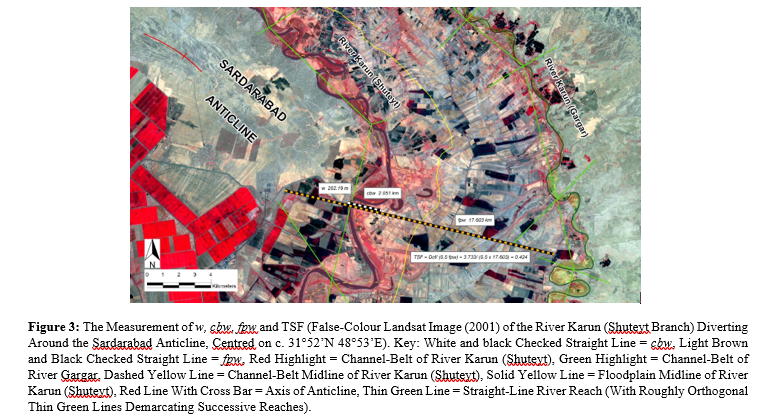 For the example of the River Karun (Shuteyt) diverting around the Sardarabad Anticline, channel-belt width, cbw = 2.051 km, at the location where the projection of the fold axis intersects with the main river channel, as shown in Figure 3 by the white and black checked straight line.