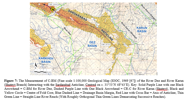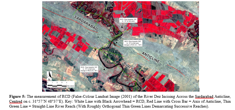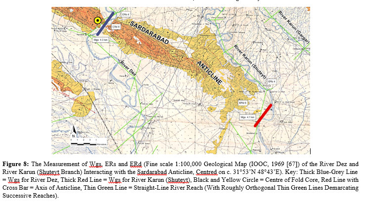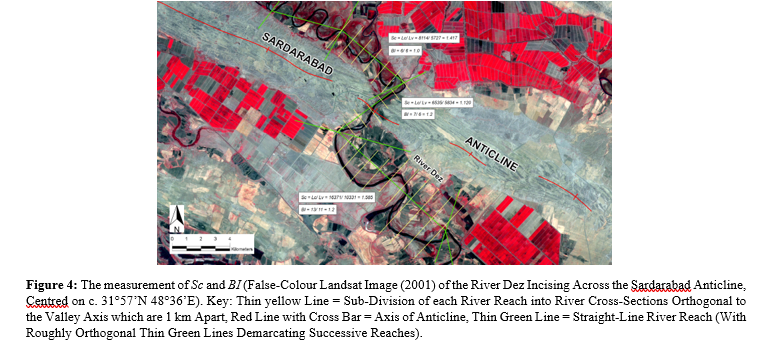 For the example of the River Dez incising across the Sardarabad Anticline, channel sinuosity, Sc = 1.417 (immediately upstream of fold); 1.120 (across fold axis); 1.585 (immediately downstream of fold), as shown in Figure 4