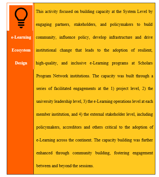The COVID-19 pandemic has had negative effects on virtually every sector of the global economy and educational institutions have not been spared. Inevitably, Higher Education Institutions (HEIs) have a key role to play towards ensuring the youth are adequately equipped with skills that are relevant to the 21st century’s digital transformation and although HEI leaders have sought innovative solutions, many have found their efforts falling short, lacking the internal resources and infrastructure to make such sudden and drastic changes. While some successfully transformed their modes of instruction to online platforms, allowing access to relatively more continuous education [1], others, particularly in low-income countries, encountered the greatest challenges (i.e., inadequate infrastructure, personnel, and instructional and curricular capacities) [2]. Learning was lost, especially among students in the global south [3,4]. Using funding from and in partnership with a multinational foundation, researchers representing one private university in Africa and one public university in the USA co-designed and co- implemented a large e-learning initiative. This program provided support for ten institutions of higher e-learning in Africa, the Middle East, and Central America.