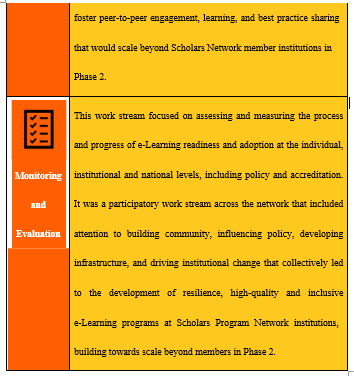 Also, the Covid-19 pandemic has devastated global economies, healthcare systems, and institutions including universities. It has accelerated trends towards the digitalization of economic and social life and the need for digital skills. While previous papers provide significant contributions, this paper informs decision- making on implications of e-Learning with recommendations for future development, focus on infrastructure, capacities, competencies and reforms. The authors envisage that these decisions shall inform the perspectives and practices of others leading or working within other e-Learning initiatives globally. Important to note is that the research team also explored how this initiative influenced community building, new policies and procedures, and infrastructure development. The authors also investigated how this initiative, as per study participants’ perspectives, contributed to institutional changes, minimized learning loss, helped build infrastructure, and improved online learning capacities and competencies. Finally, the findings shared in this paper support the authors’ overall conclusion that this initiative significantly contributes towards enabling participating institutions to progress toward higher quality and inclusive online learning environments.