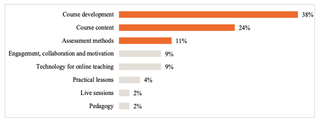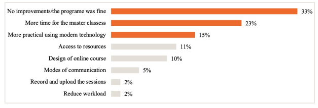 Figure 4 below illustrates aspects of the master class activity that teaching staff felt could be improved. A third of the teaching staff (33%) felt that the Master Class program was fine and that no part/aspect needed to be improved. The main suggestions for improvement were the following: to provide more time for the Master Class sessions (23%, n=14), to be more practical using technology (15%, n=9), to increase access to resources (11%, n=7), to modify the course design (10%, n=6), to diversify modes of communication (5%, n=3), to reduce the workload (2%, n=1), and need for recording and uploading the sessions for future reference (2%, n=1).
