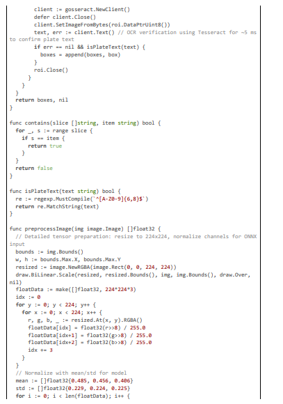 Our system extends these with multi-stage detection, as in the following code excerpt, combining Haar for coarse localization and YOLO for refinement, with OCR to verify plates, achieving ~95% F1-score while maintaining 20 ms latency through optimized preprocessing.