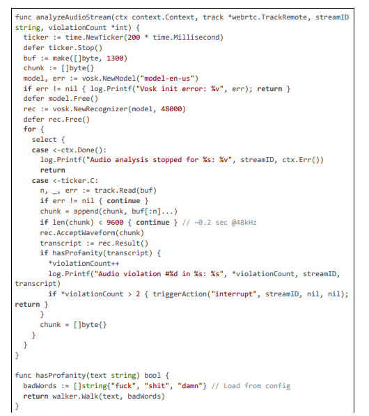 Although primarily visual, our framework can extend to audio for comprehensive compliance. Stream (2025) and Deepgram (2025) offer STT for profanity, but with ~200 ms latencies. Vosk provides offline STT (~5 ms), as in our code.