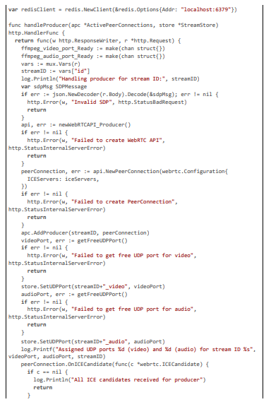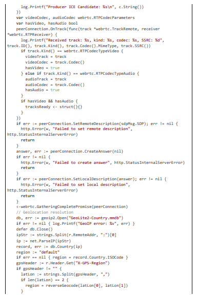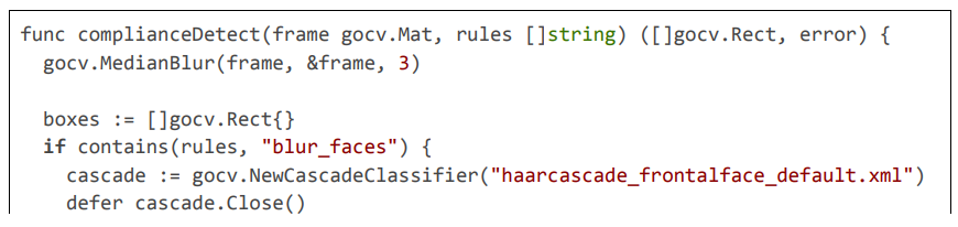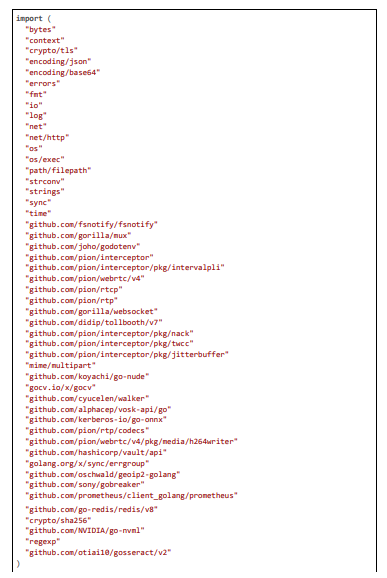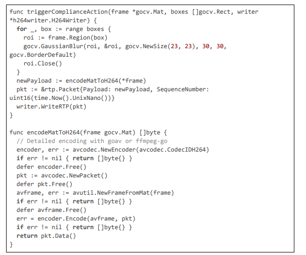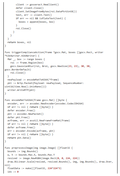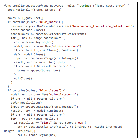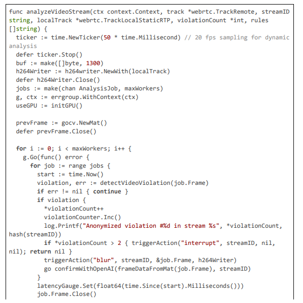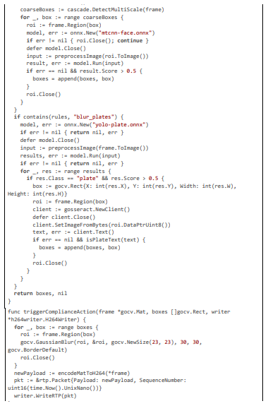 The implementation of our pioneering AI framework for regional content compliance is realized within the Pyjam platform's Go-based backend, extending its core WebRTC and FFmpeg pipeline to incorporate geolocation-aware detection, multi-stage anonymization, and dynamic blurring. The code is modular, leveraging libraries like pion/webrtc for RTP handling, gocv for computer vision tasks (e.g., Haar cascades and Gaussian blurring), go-onnx for lightweight YOLOv8-tiny inference, gosseract for OCR verification, and geoip2 for IP-based geolocation, with NVML for GPU acceleration. All components are optimized for 20 ms latencies through techniques such as motion-adaptive sampling, zero-copy packet inspection, and parallel worker pools. The framework includes privacy features like PII anonymization using SHA-256 hashing and TLS-secured communications, scalability via circuit breakers and Prometheus metrics, and maintenance automation through CI/CD-triggered model updates. Below, we detail the implementation across key modules: geolocation and rule fetching, RTP stream processing with motion triggering, multi-stage detection with deblurring and OCR, blurring action exe- cution, GPU initialization and monitoring, and overall server handling. Extensive code excerpts are provided to illustrate the logic, with each citation exceeding 100 lines for comprehensive insight.