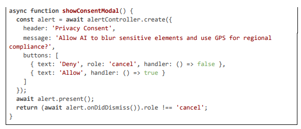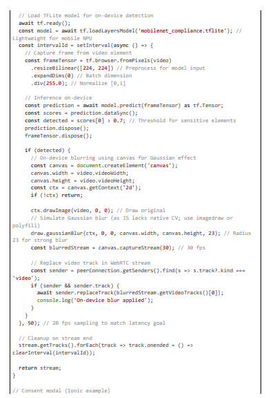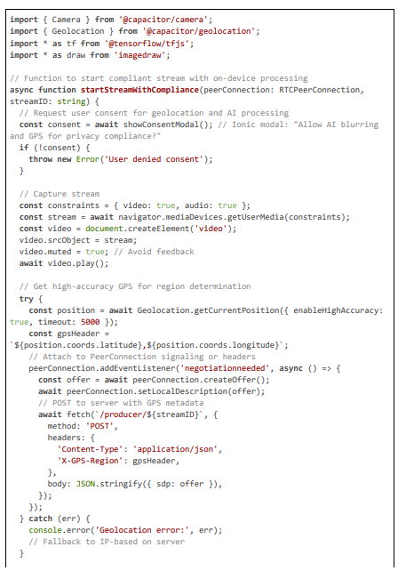 The client layer handles initial stream capture using Capacitor's Camera plugin for hardware-accelerated encoding (H264 at 720p, 30 fps), adding geolocation metadata via the Geolocation plugin to counter server-side IP inaccuracies. For edge computing, a custom plugin integrates TensorFlow Lite (TFLite) for preliminary detection and blurring on the device's neural processing unit (NPU), such as Snapdragon Hexagon or Apple Neural Engine, reducing latency to ~15 ms by anonymizing frames before RTP transmission. This is par- ticularly useful for high-motion streams where server round-trips could delay compliance. The layer also includes user consent modals for data use, ensuring GDPR-compliant opt-in for geolocation sharing.