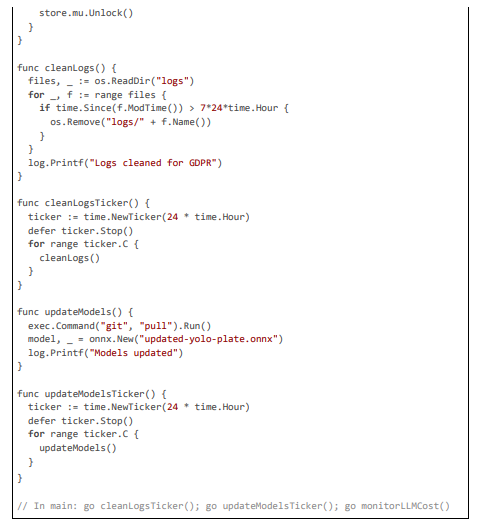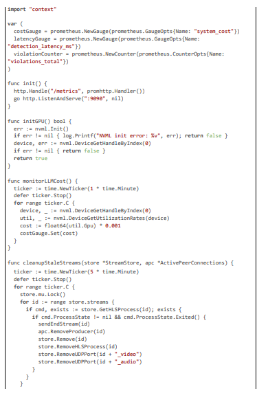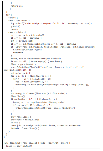 The design's latency optimizations are central, targeting 20 ms through selective processing: keyframe sampling (processing only I-frames at 2-4 per second to focus on significant changes) combined with motion magnitude thresholds (computed via optical flow to trigger full analysis on dynamic frames). Hardware acceleration via NVIDIA NVML enables TensorRT-optimized inference for YOLO models, dropping detection times to 5 ms per frame [20]. Privacy is enforced through PII anonymization (e.g., hashing identifiers before logging) and TLS-secured channels, aligning with ethical standards for adolescent users. Scalability is achieved with errgroup worker pools (scaling to 100 streams per node) and gobreaker circuit breakers for fault-tolerant notifications, while maintenance is automated via CI/CD pipelines for model retraining and rule updates. Below, we detail each component, with large code citations exemplifying the implementation.