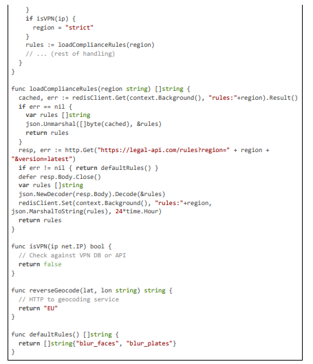Geolocation is resolved hybridly in the handleProducer endpoint: IP-based using MaxMind GeoIP2 for baseline country codes, aug- mented by client-sent GPS headers for precision against VPNs. Rules are fetched dynamically from a legal API, cached in Redis to minimize latency (~5 ms for subsequent requests), and passed to analysis goroutines. This ensures adaptive compliance, with fallback to strict defaults if API fails.