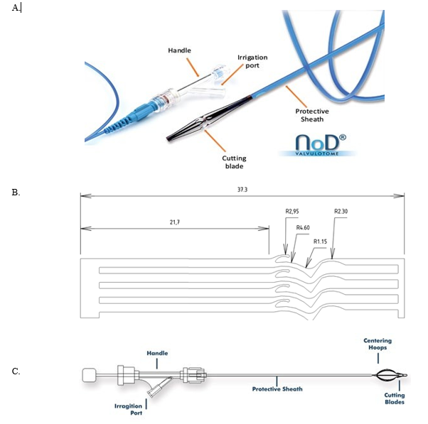 Valvulotome is technologically and operationally similar to the LeMaitre Valvulotome (LeMaitre Vascular, Burlington, MA, USA), another commercial valvulotome device. Their self-siz- ing and self-centering close to the targeted valve provide ease of use for surgeons, high safety, and comfort for patients. During the intervention, damage to the vein intima is minimal due to the special design of the blade, and the valve leaves are cut traumat- ically without tearing. The devices contain a hydrophilic coat- ing on the protective sheath to improve push ability by reducing friction.