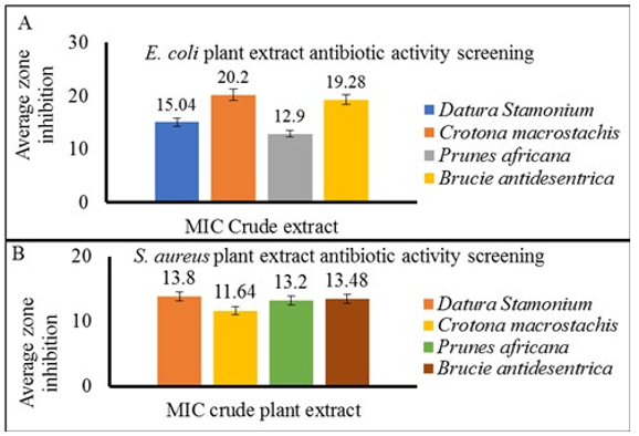Prunes africana was also observed with zero to little colony count of S. aureus at 400mg/mL, 200mg/mL and 100mg/mL concentration. In other cases, zero to little E. coli colony was counted at a concentration of 400mg/mL and 200mg/mL for three plant extracts (Brucie antidesentrica, Crotona macrostachis and Prunes africana). Whereas 300CFU, 268CFU, and 260CFU E. coli colony was counted at a concentration of 100mg/mL for Brucie antidesentrica, Crotona macrostachis and Prunes africana respectively. But the highest concentration (400mg/ mL) with zero E. coli colony count was recorded for Datura stamoniums and 280CFU at 200mg/mL whereas TNTC were observed at 100mg/mL, 50mg/mL and 12.5mg/mL concentration (Table 2).