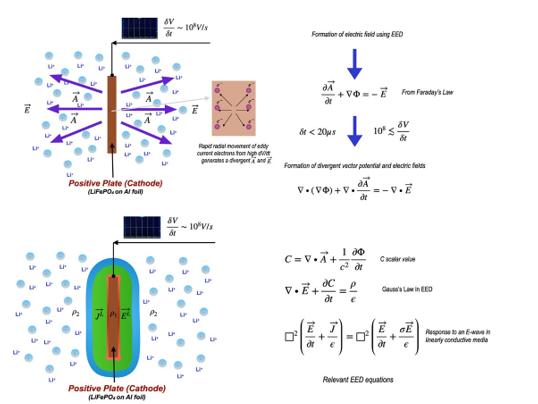Using extended electrodynamic theory (EED), developed across various disciplines over the last three decades, new mechanisms have been proposed that include the longitudinal and scalar com- ponents of EM waves that are not usually recognized or applied in electrical engineering. Figure 8 depicts how pulses of sufficiently high slew rate can generate divergent vector potentials and scalar components. Here, these components contribute to the energy im- parted to charged particles within the electrolyte, but which are not routinely recorded in the solenoidal based measurements equip- ment used to record input power. Apart from any other energetic processes that may be occurring, this will tend to drive towards a CoP>1 since the actual total input energy is not being fully mea- sured by normal instrumentation.