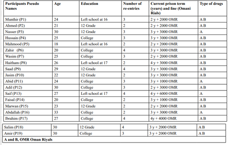 Methods: We recruited 19 Omani males aged 18–35 imprisoned in Oman Central Prison using purposive sampling. We conducted a focused ethnography over 8 months to explore drug-related experiences both outside and during prison. Face-to-face, semi-structured interviews with the participants yielded detailed transcripts and field notes. We thematically analyzed these and compared the results with the existing literature.