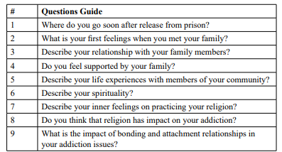 We use semi-structured interviews to explore issues and gather information about the phenomena under investigation because they enable participants to share their stories in greater detail [9,13]. We developed these interview guides based on their personal understanding of the topic under investigation. We asked the participants to elaborate on their journey and how they reintegrated into their families shortly after their release from prison based on the guide. The question guide included open-ended questions about close relationships with their family members. (Table 2) After their release from prison, the participants discussed returning to their families, friends, and neighborhoods. Participants had experienced obstacles and difficulties because their families had misconceptions about addiction, even though many families were educated; however, they were still under the influence of old traditional Omani families, where illiteracy was prevalent. The study will present the participants' initials as P followed by a number.