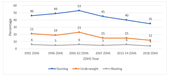 Zambia’s childhood stunting levels have declined over the succes-sive demographic health surveys (between 2001/2 and 2018). The highest stunting levels were reported in 2001/02 with one in every two children under five (53 %) being stunted (Figure 2). A similar depiction is observed for underweight and wasting levels over the same period.