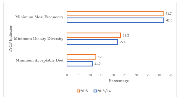 Figure 3: Prevalence of infant and Young Child Feeding Practices (IYCF) among children ages 6-23 months, ZDHS 2013/14 and 2018