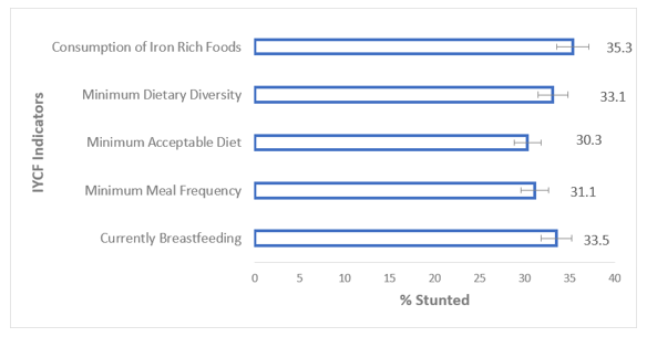 Figure 4 demonstrates that about three in 10 children ages 6-23 months were stunted across the three IYCF practices indicators, however, stunting was generally more prevalent among children who were not fed on iron-rich foods, did not receive diverse di¬etary meals, did not receive an acceptable diet and were not fed frequently. Similarly, more children were stunted among those who were not currently breastfed (see table 2).