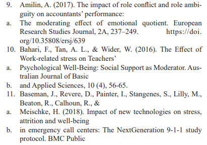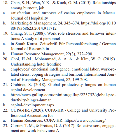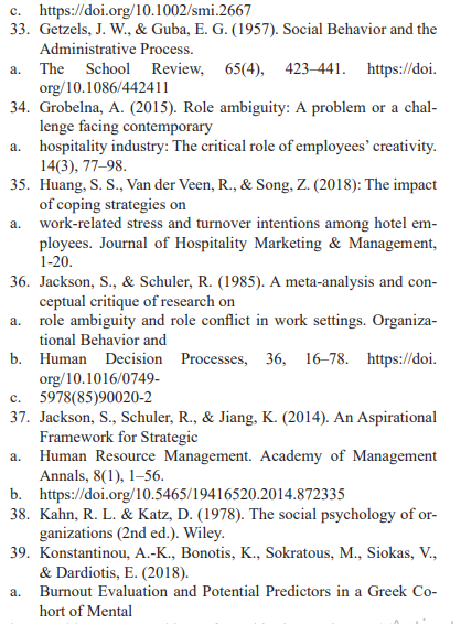 Role conflict can also be objective or subjective in nature. Further categorized role conflict into four major types; person-role con¬flict, intra-sender conflict, inter-role conflict and inter-sender con¬flict. The inter-sender role conflict and the intrasender role conflict have been categorised under the sent role conflict.Akkoç, Okun and Türe (2020)indicatedthatroleconflictandambiguityiswhenan-employeedoesnot have adequate information that enables him/her to carry out his/her tasks more effectively.They further argued that role conflict and ambiguity relate to the amount of stress experi-encedby an individual due to unclear specifications regarding the performance expectations, duties,responsibility and constraints that define the individual’s job. Bahari, Tan and Wider (2016) added that roleambiguity leads to dissatisfaction, lack of self-es-teem, feelings of uselessness, depression,increasedblood pressure, stressandintentiontoleave theorganization.
